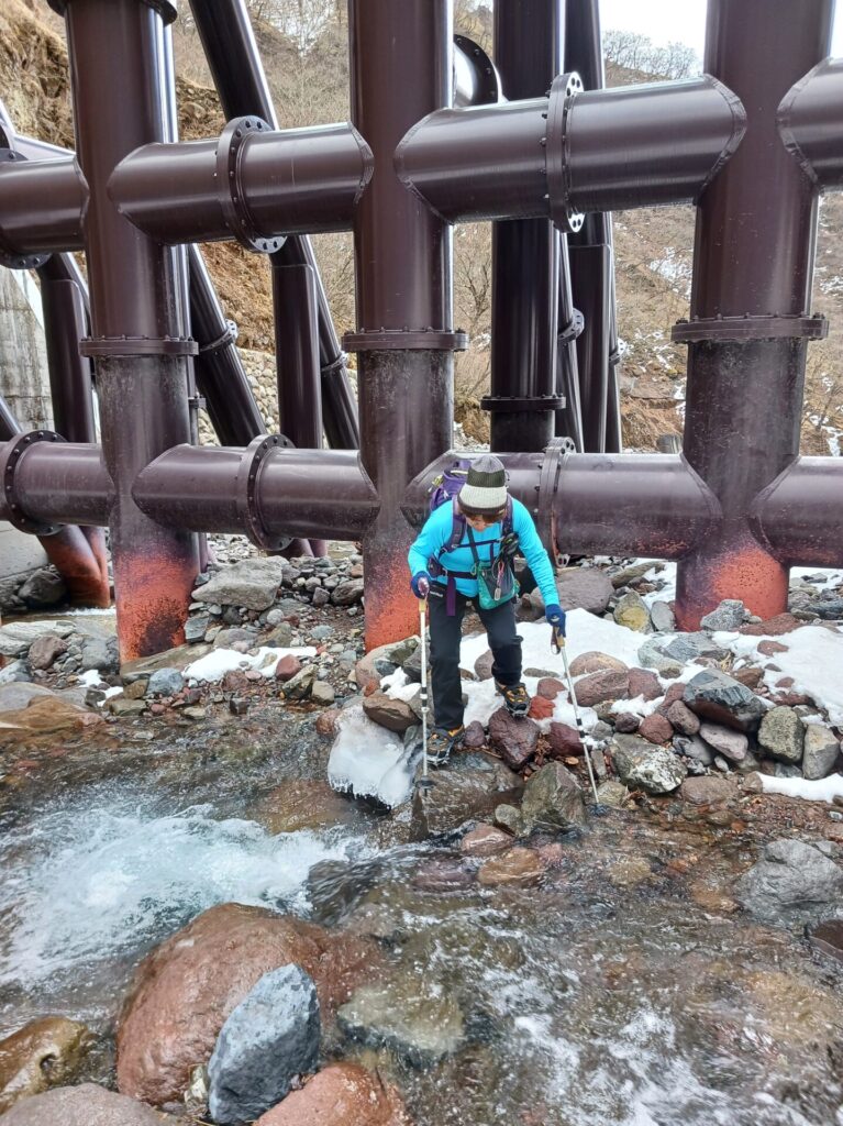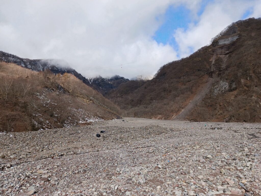 巨大な堰堤を越えると広い河原を渡ります。本日最初の渡渉。その後も道に雪はほぼついておらず、だいぶ奥でチェーンスパイク履きました。