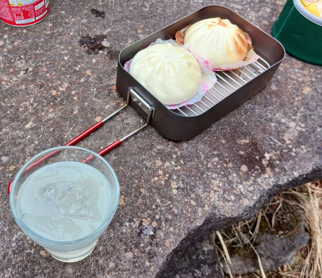直下は危ないので離れたところで昼食。肉まんと氷瀑の氷で酎ハイ(ノンアルです(;^_^A)